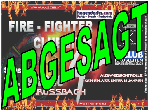 Auf Grund der Witterungsverhältnisse in den letzten Tagen und den Aussichten auf das Wochenende musste die FF-Niederrussbach schweren Herzens die ABSAGE des FireFighter-Clubbings No. 4 beschließen. Wir danken allen die unsere Parties bis jetzt immer besucht haben und hoffen auf ein Wiedersehen bei der nächsten Party! Nähere Infos zu neuen Terminen, etc. erfahrt ihr hier bzw. auf den Eventpages www.timetoparty.at bzw. www.hagendorfer.com!